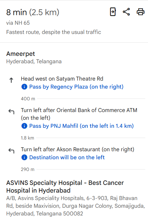 - Head west on Satyam Theatre Road (Pass Regency Plaza) – 400 m