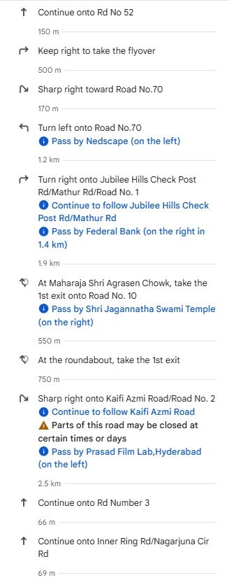 - Turn right onto Jubilee Hills Check Post Road / Road No. 1 (Pass Federal Bank) – 1.9 km