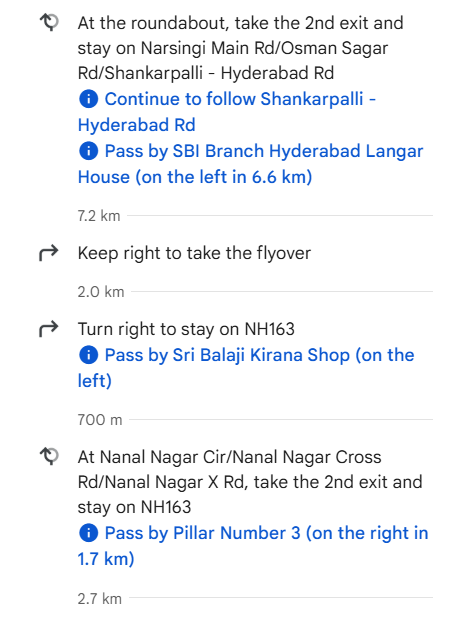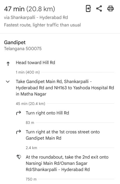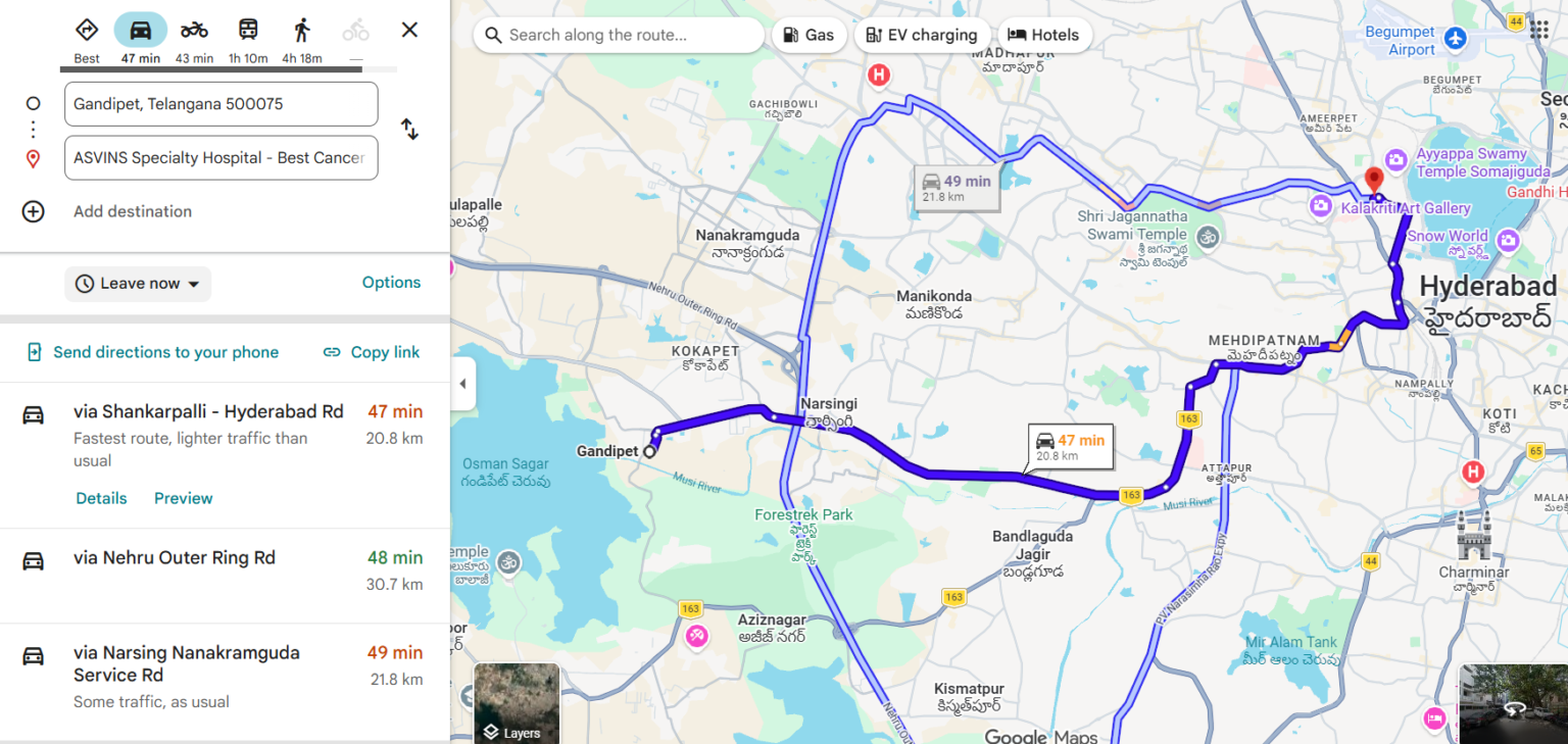 - At the roundabout, take the 2nd exit onto Narsingi Main Road / Shankarpalli – Hyderabad Road – 750 m