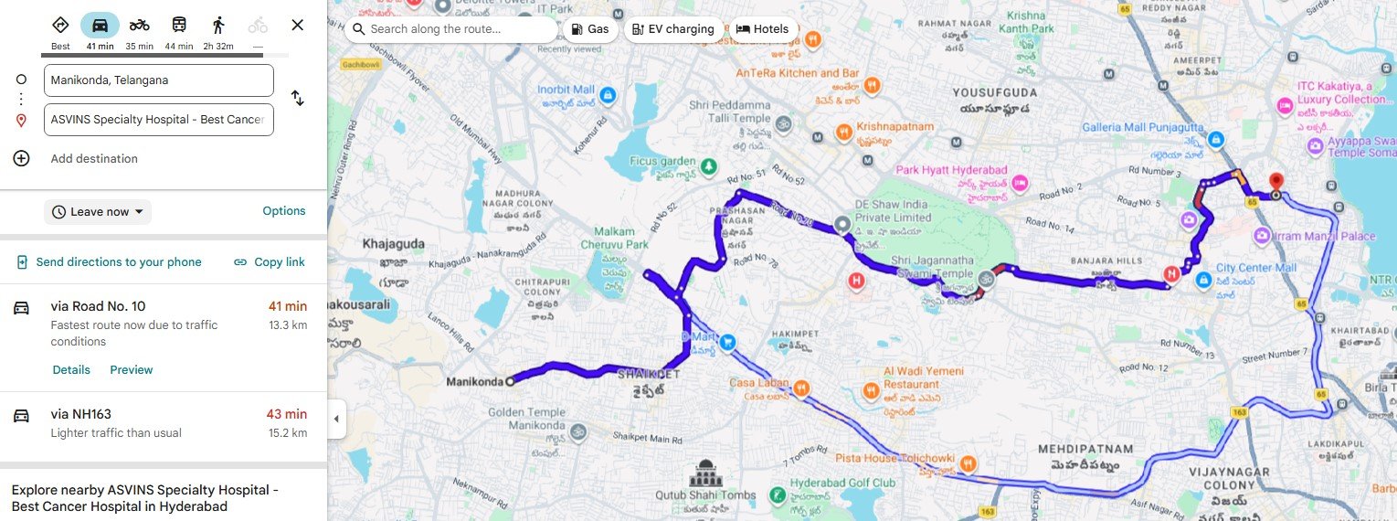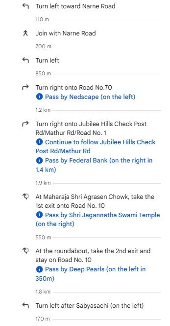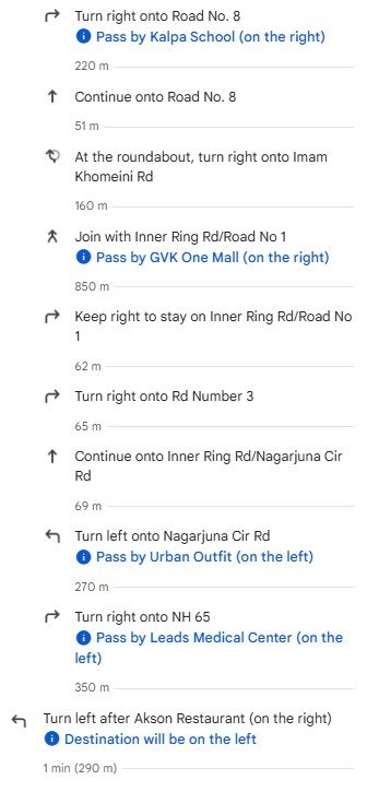 - Continue onto Jubilee Hills Check Post Road / Road No. 1 – 280 m