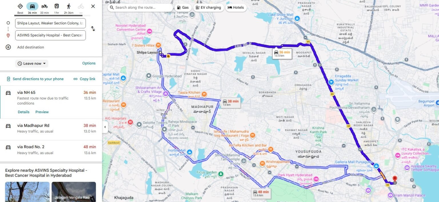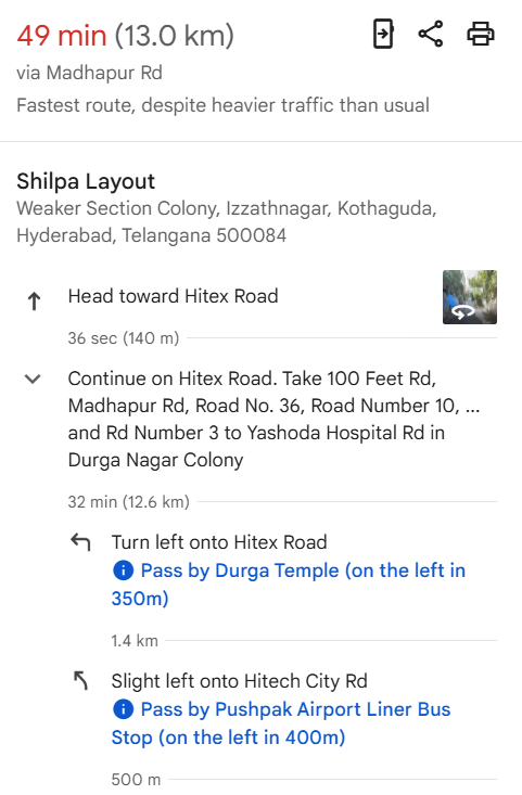 - Turn left onto Hitex Road (Pass Durga Temple) – 1.4 km