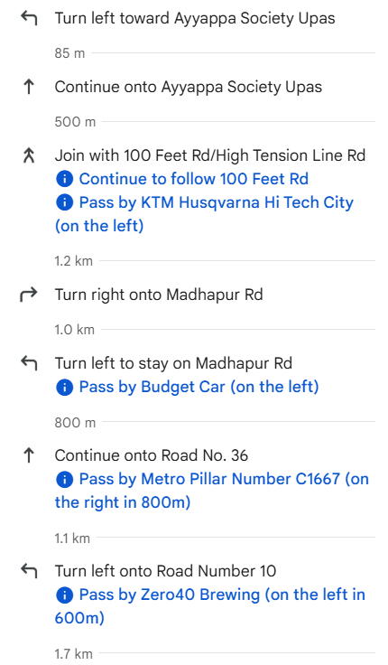 - Turn left to stay on Madhapur Road (Pass Budget Car) – 800 m