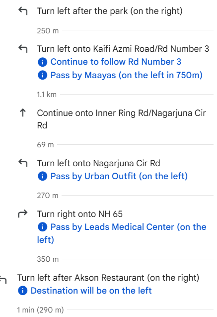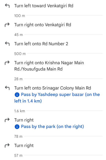 - Turn left onto Srinagar Colony Main Road (Pass Yashdeep Super Bazar) – 1.6 km